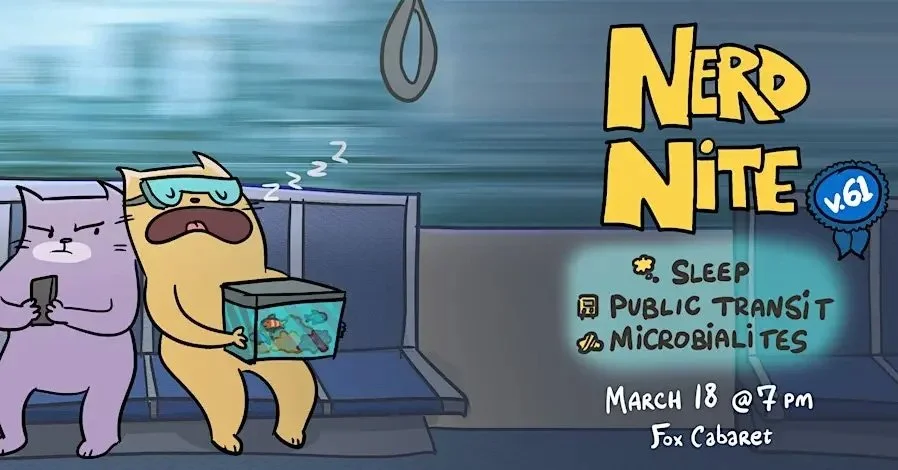 Nerd Nite is back with Nerd Nite v61! Join us in the Nerd Den for an evening of fun talks about quirky science topics. We'll dive into the mysteries of sleep, explore the ins and outs of public transit, and uncover the cool world of fresh water microbialites. Perfect for curious minds looking to learn and laugh!