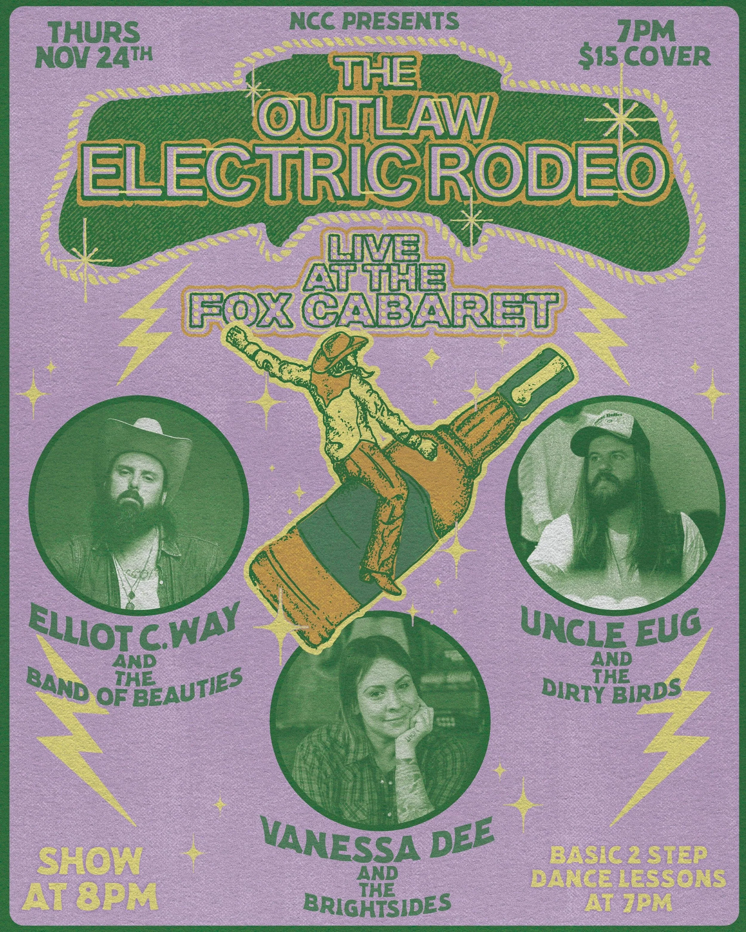 North Country Collective presents round 2 of their rowdy and wild Electric Rodeo country dance party with Elliot C. Way & The Band of Beauties, Uncle Eug & The Dirty Birds, + Vanessa Dee & The Brightsides!