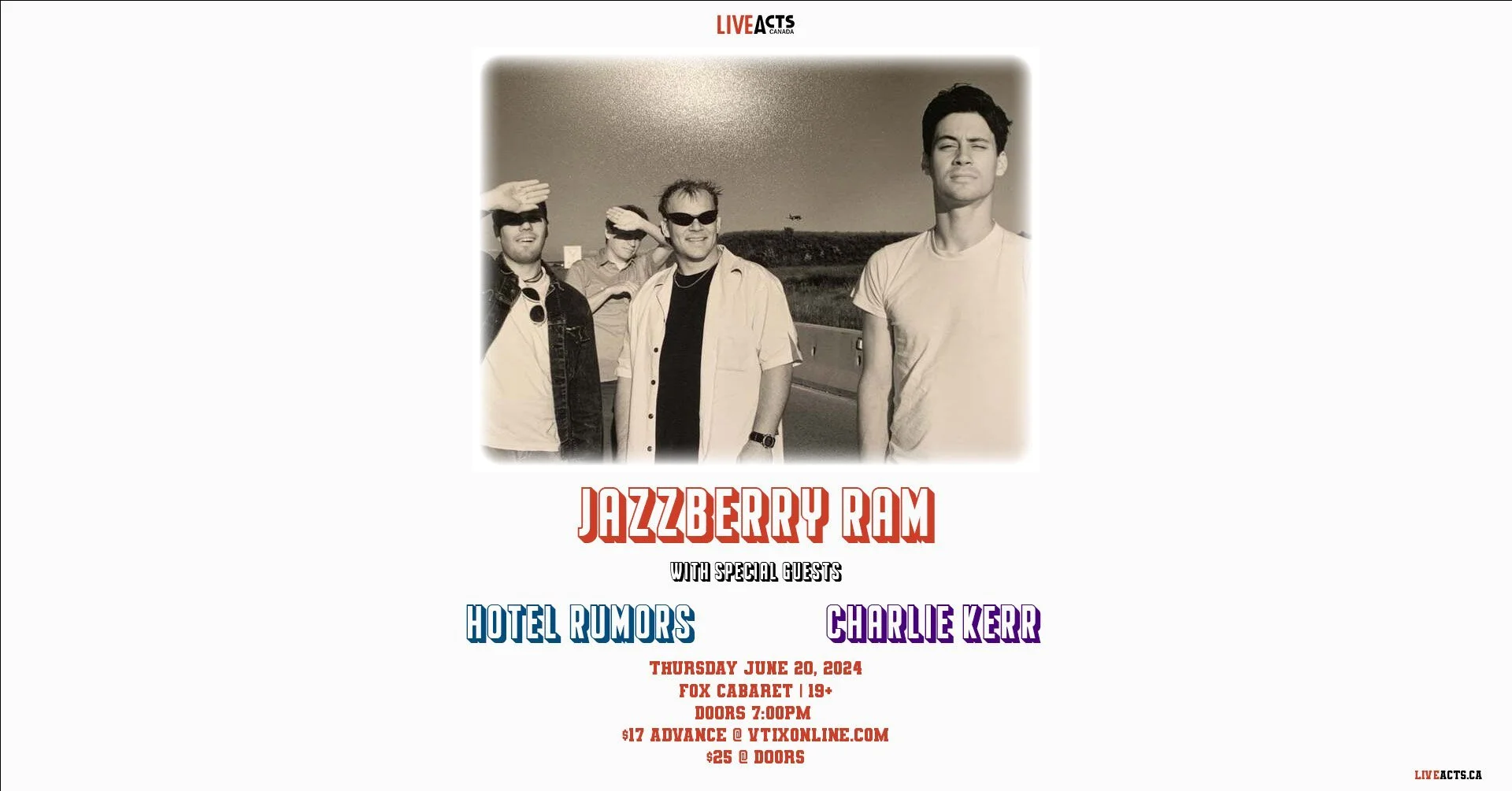 Live Acts Canada presents Jazzberry Ram with Hotel Rumors and Charlie Kerr.