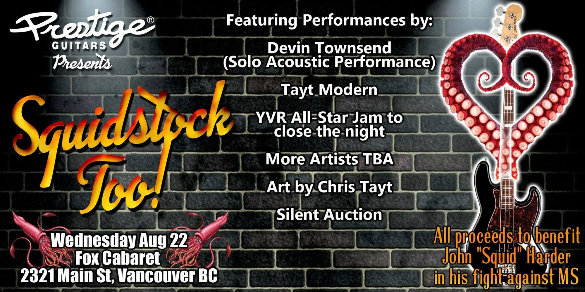 Vancouver's own Prestige Guitars presents SQUIDSTOCK TOO! A benefit for John "Squid" Harder in his fight against MS and all door + auction proceeds from this event will be going to Squid directly.